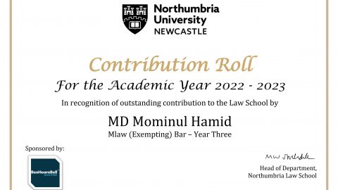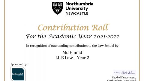 I have been honoured to receive the Contribution Role Award for the Third Consecutive Year at Northumbria Law School.